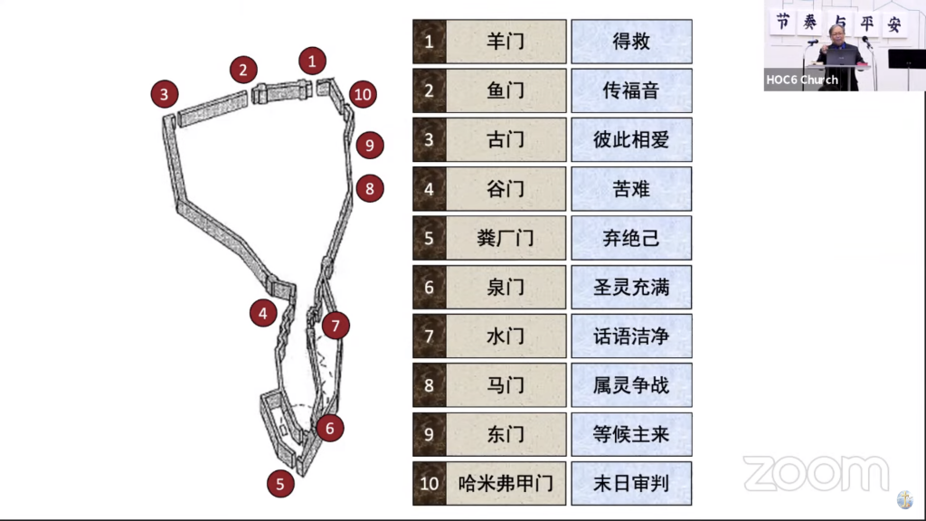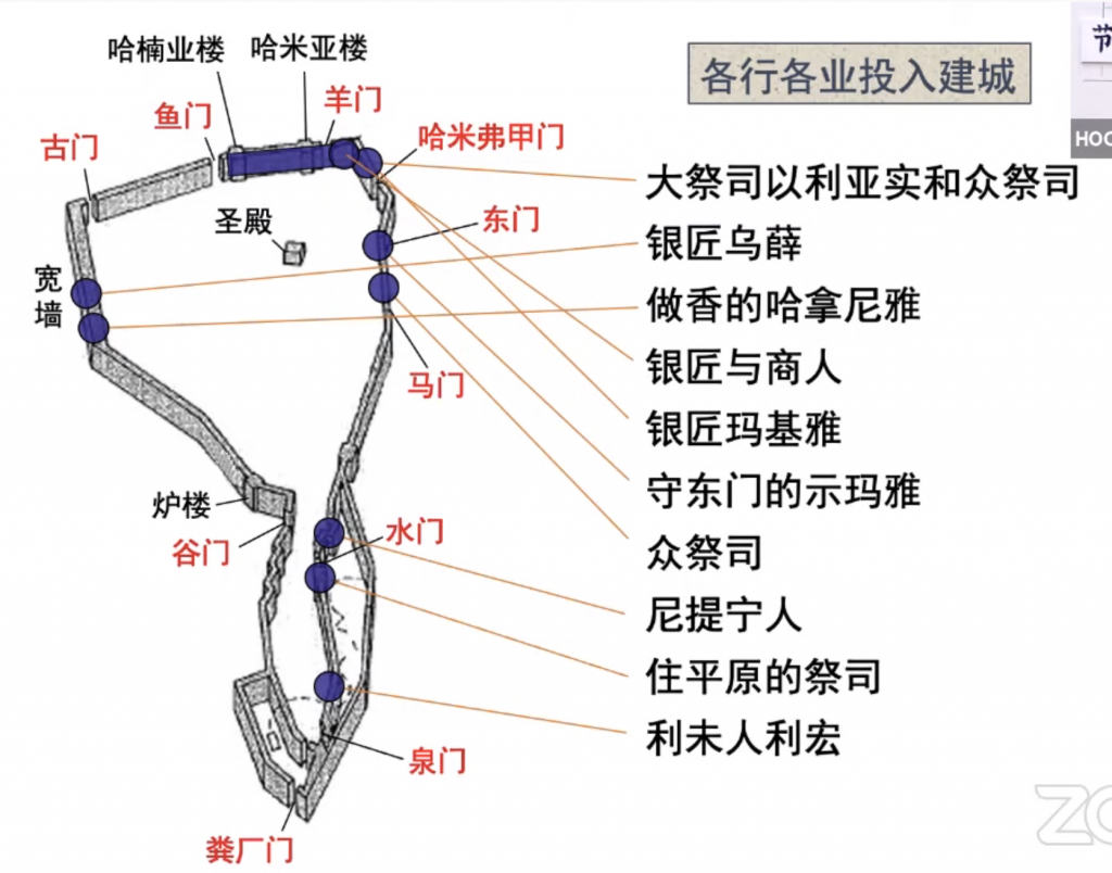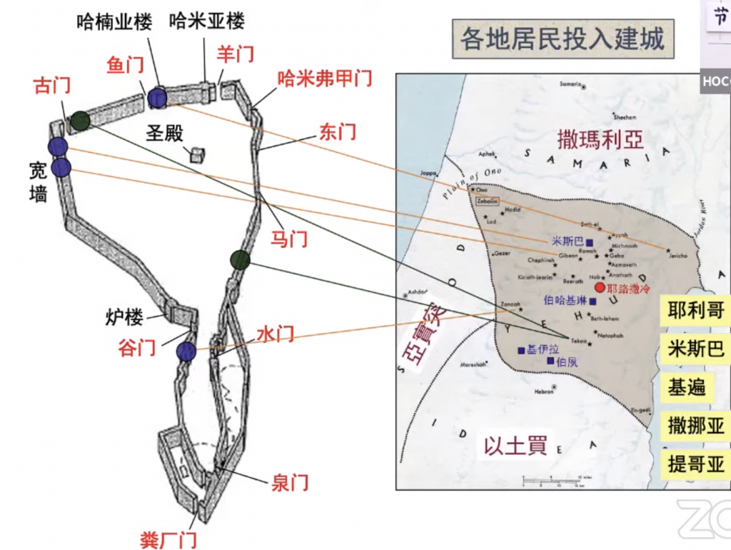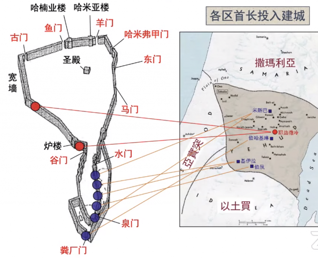 - 上次程长老讲道时提到尼希米记第一章:国度视野、积极祷告、实际行动,尼希米看见、祷告、行动,要带领犹太人重建城墙;而黎牧师则在第二章提到重建城墙要有心:关切的心、认同的心、信靠的心。第三章大家分工重建城墙!