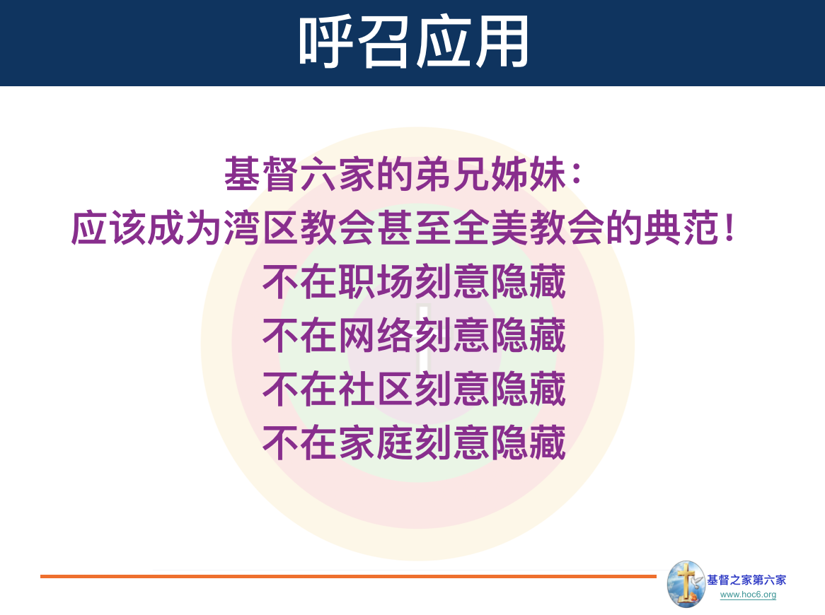 HOC6的弟兄姊妹要勇于从创建和参与职场团契开始,不在职场,社区,家庭和网络等领域隐藏,为主见证。