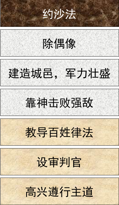 约沙法王执政期间也确立了较佳的司法制度。王亲自告诫审判官,审判要大公无私、不偏不倚,绝不可收受贿赂,因为他们审判不是为人,而是为耶和华。(代下