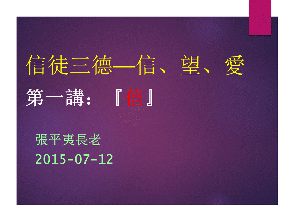 7/12: 主日信息《信徒三德—第一講“信” 》 (张平夷长老) 07/12/2015 hoc6 讲台信息 0 基督六家主日信息 录音: http://hoc6.org/files/hoc6/sermon/20150712.mp3 录像: PPT: 点击阅读: 4,704