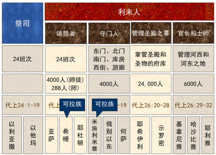 歷代志九章的家譜是以一個扇形結構來寫的,而這扇形結構的中心便是利未支派的家譜,而利未家譜的中心便是亞倫後代及聖殿中歌頌者的家譜,可見歌頌者在歷代志作者心中佔據着崇高的地位。