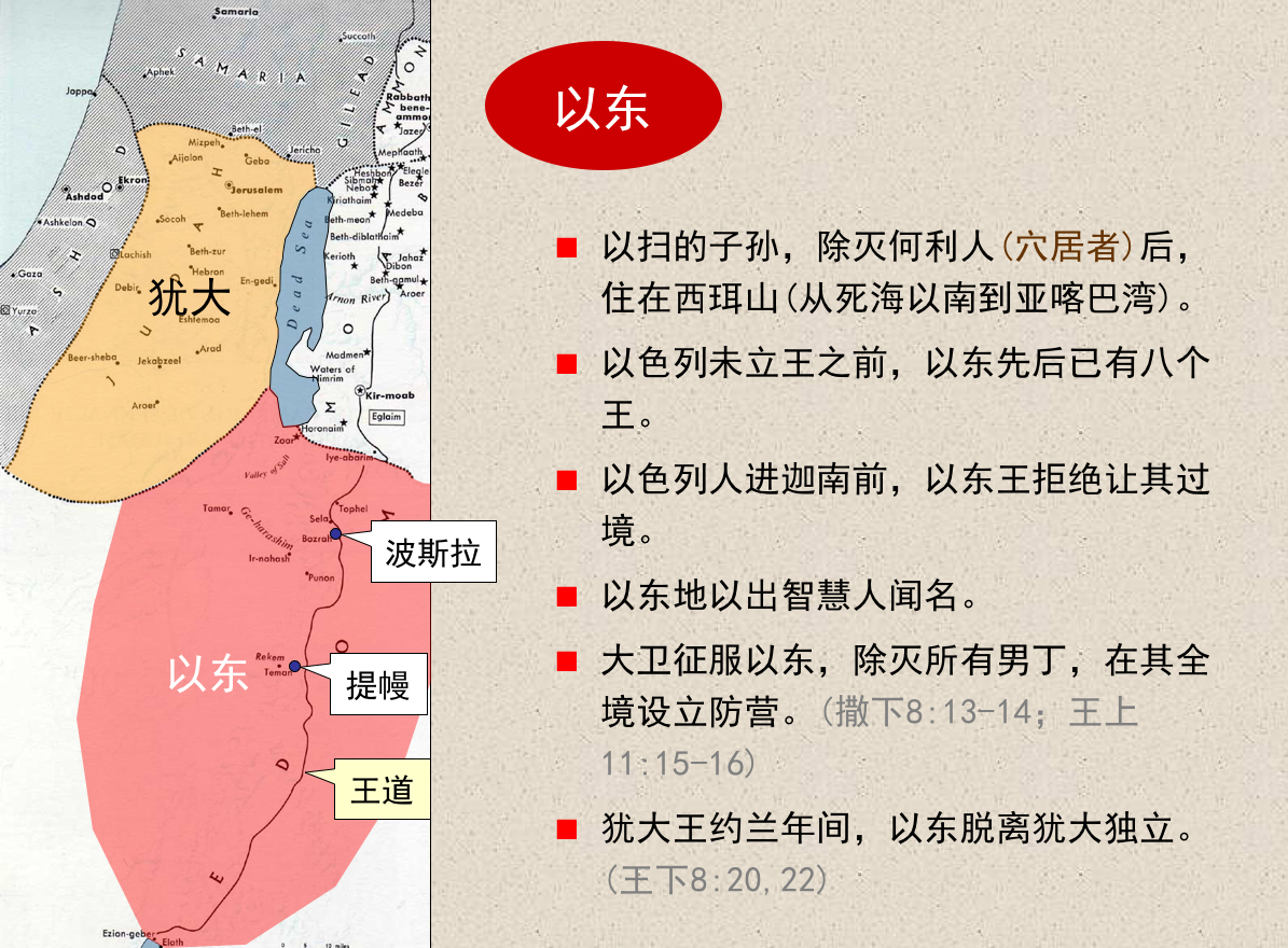 - 大卫征服以东,除灭所有男丁,在其全境设立防营。(撒下8:13-14;王上11:15-16)
