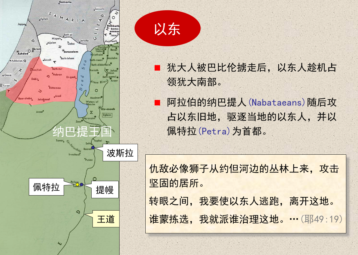- 阿拉伯的纳巴提人(Nabataeans)随后攻占以东旧地,驱逐当地的以东人,并以佩特拉(Petra)为首都。