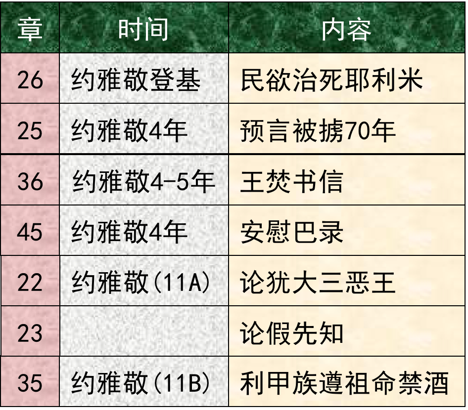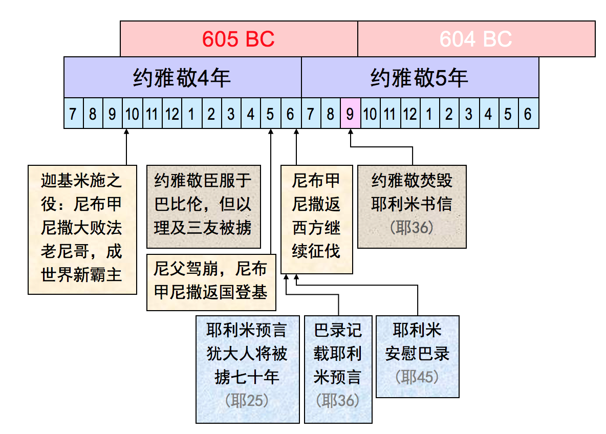 列王纪下24:1说,尼布甲尼撒王向犹大王施压,“约雅敬就臣服他[成为他的附庸]三年,后来却反叛他[尼布甲尼撒王]”。看来但以理书1:1所说的“约雅敬作王第三年”,指的是约雅敬王臣服巴比伦王的第三年。这不可能指约雅敬作王统治犹大十一年中的第三年,因为当时约雅敬王是埃及法老尼哥的附庸,不是巴比伦王的附庸。直到约雅敬作王统治犹大的第四年,尼布甲尼撒王才在迦基米施打败埃及(公元前625年[看来在尼散月之后]),夺去了埃及对叙利亚和巴勒斯坦的控制权。(耶46:2)约雅敬王反叛巴比伦王,结果在统治了约十一年后失去王位。这样看来,约雅敬王臣服巴比伦王的那三年,必定始于他统治第八年的末了,亦即公元前620年年初。