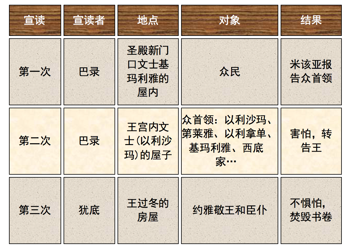约雅敬王在位第四年(公元前625),尼布甲尼撒王跟法老尼哥在迦基米施开战,为要争夺叙利亚和巴勒斯坦的控制权。迦基米施位于耶路撒冷以北约莫600公里(370英里),在幼发拉底河畔。(耶46:1,2)在同一年,耶利米开始将耶和华针对以色列、犹大和列国所说的话口授书记巴录。于是,耶利米自约西亚王在位第十三年(当时约雅敬才六岁左右)以来所接获的信息,都写在书卷上。差不多一年后的阴历九月(基斯流月,相当于公历11和12月之间),犹底在约雅敬王的冬宫里,把含有这些信息的书卷宣读给王听。犹底每读完三四栏,王就拿刀把书卷的那部分割破,扔进火盆里烧,直到全卷各栏都一一烧掉为止。三个首领恳求王不要烧毁书卷,王却不听。因为耶利米曾经预告,巴比伦王必来毁坏犹大,使犹大荒凉;这个预言令王特别反感。这样看来,当时尼布甲尼撒王还没来攻打耶路撒冷,以及使约雅敬王沦为他的附庸。(耶36:1-4,21-29)