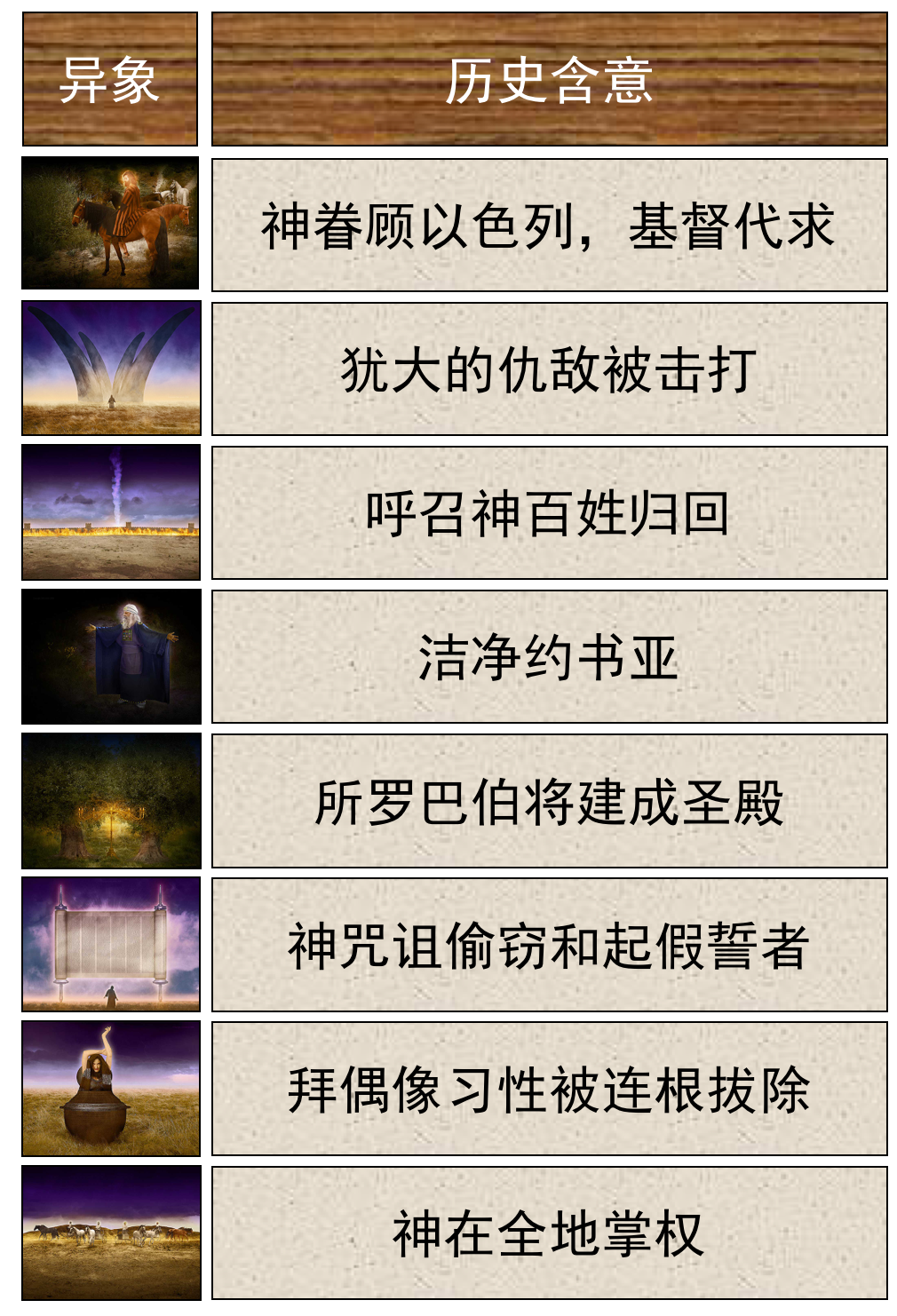 耶和华通过撒迦利亚所说的话,必然使犹太人得到莫大的安慰和激励。撒迦利亚见到的异象清楚表明,上帝定意要使耶路撒冷和圣殿得以重建。(亚1:16;亚2章)列国曾把犹大人驱散,他们的势力必被击碎。(1:18-21)大祭司约书亚会在耶和华面前得着崭新的形象(3:3-7),省长所罗巴伯则会凭着上帝的灵之助,完成重建圣殿的工程(4:6-9)。