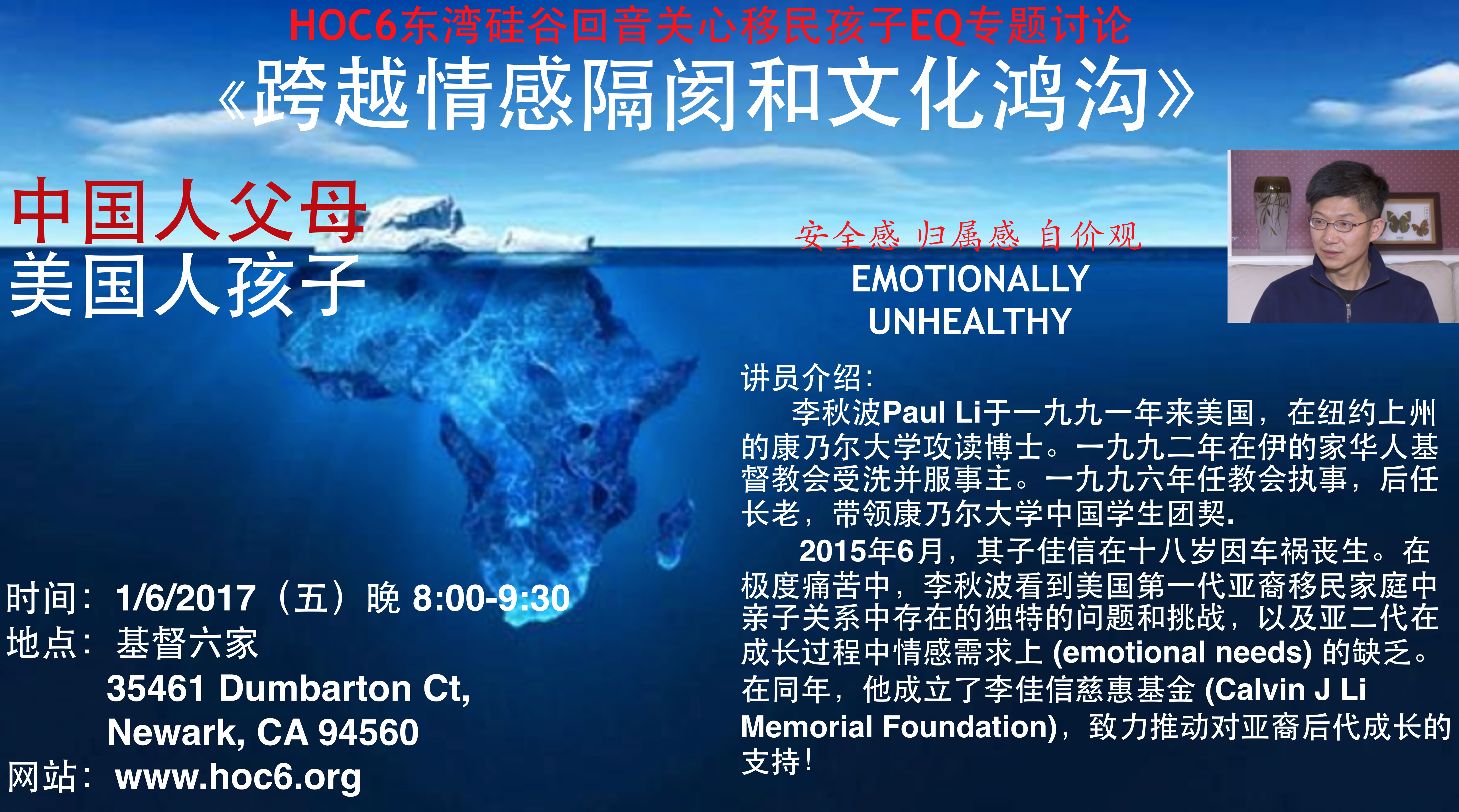 元月6号晚上,HOC6教会和东湾硅谷回音联袂举办了“中国人父母,美国人孩子”这个关于孩子EQ的特别分享会。来自东岸的李秋波来到团契的联合聚会当中给大家特别分享!当晚的聚会吸引了教会内外近百人参加,大家都度过了一个非常充实受益的夜晚!