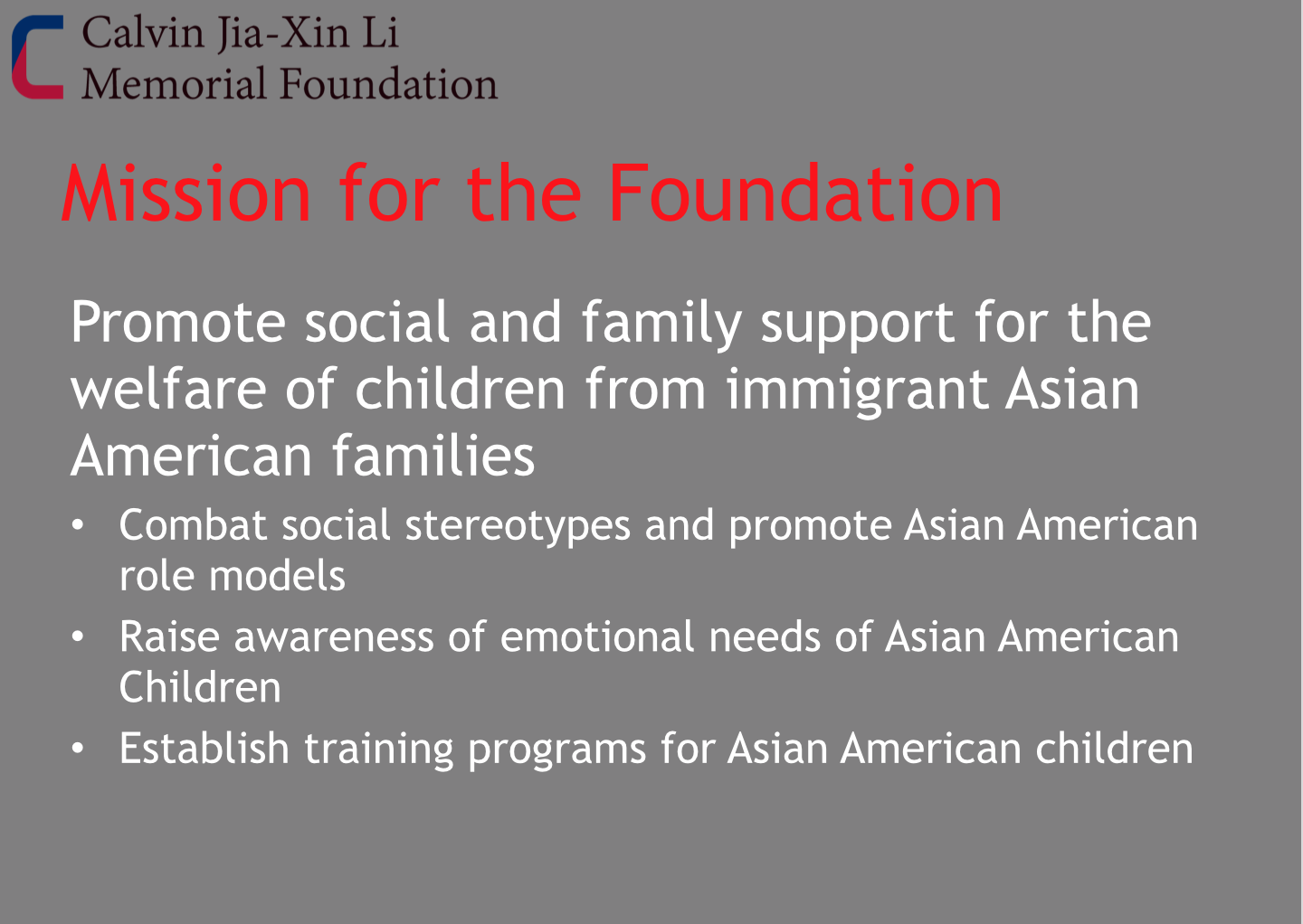 李秋波开门见山就用图片的方式介绍了在他儿子佳信在十八岁因车祸丧生这一极悲痛的故事!在极度痛苦中,李秋波感受圣灵的启示,看到美国第一代亚裔移民家庭中亲子关系中存在的独特的问题和挑战,以及亚二代在成长过程中情感需求上 (emotional needs) 的缺乏。在二零一五年,他成立了李佳信慈惠基金 (Calvin J Li Memorial Foundation),致力推动对亚裔后代成长的支持。