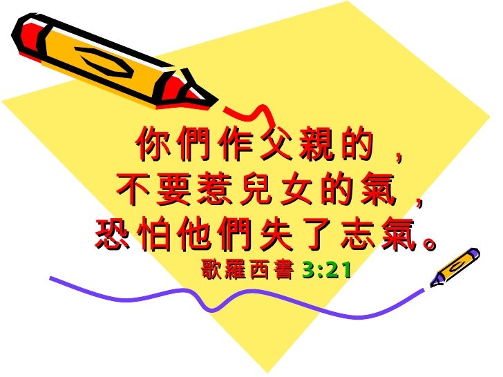 弗6:4 – 你們作父親的,不要惹兒女的氣;只要照着主的教訓和警戒、養育他們。罗马时代,父权至上,带着权柄命令的口气,容易激怒儿女,使他们失去志气。