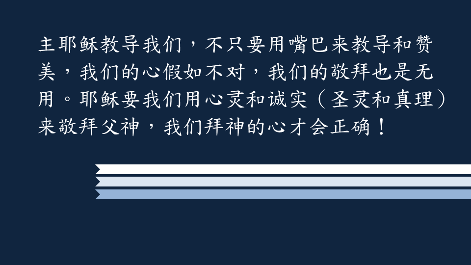 來到大會議堂,就是我們一起公禱的時段,整個堂座無虛席,國語部的、粵語部的、英語部的濟濟一堂,在黎牧師和黎娜姐妹的帶領下開始了公禱。三個堂各以詩歌來敬拜讚美我們的主,雖然有的言語不通,但當讚美的旋律響起了的時候,大家的心靈都是相通的—讚美敬拜主直達到祂的寶座前。最後有黎牧師分享信息“敬拜讚美”,讓我們對敬拜讚美有了更加清楚的認知。(请看以上信息幻灯片图片)