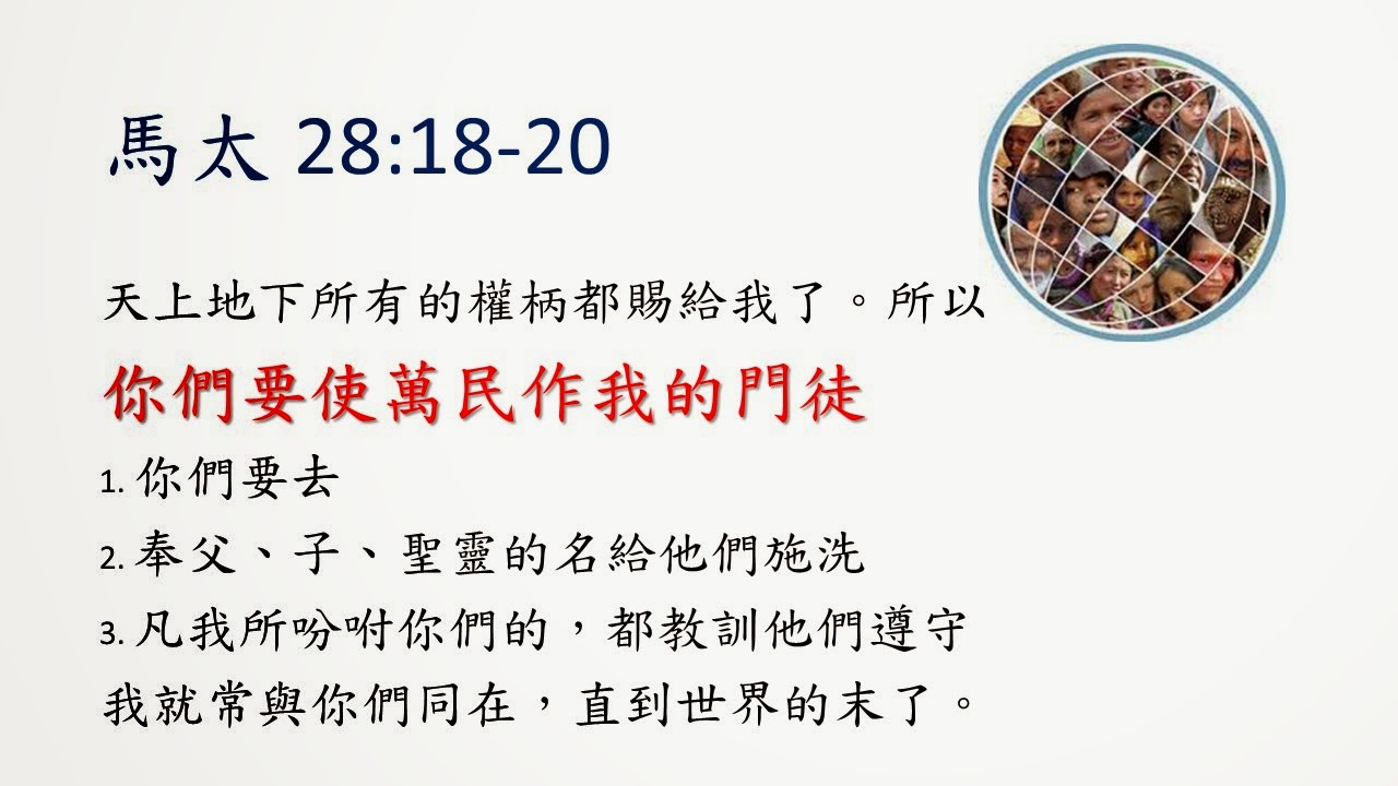 马太福音28:19-20 “所以,你们要去使万民作我的门徒,奉父、子、圣灵的名给他们施洗。凡我所吩咐你们的,都教训他们遵守,我就常与你们同在,直到世界的末了。”