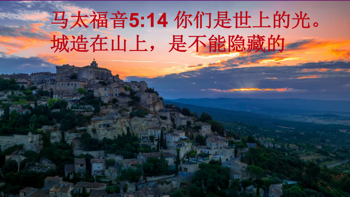 马太福音5:14 你們是世上的光.城造在山上、是不能隱藏的