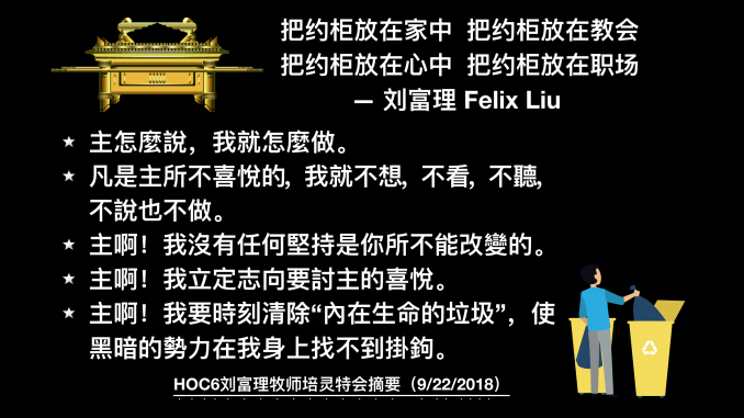 HOC6劉富理牧師培靈會(9/22-23/2018) 09/23/2018 hoc6 讲台信息, 讲座分享 0 2018年9月22-23日,正道神学院荣誉院长刘富理牧师在基督六家用《经历神》为主题给会众们一系列精彩的分享。 五段音频如下: 5段录像视频如下: 每个分别的视频点击如下: 第一讲: 《榮耀神—靈命塑造的落實》 第二讲:《見證神—願上帝的國降臨》 第三讲:《敬畏主—迎接約櫃在我家》 第四讲:《經歷神-經歷聖靈的更新》 第五讲:《親近神—重整禱告的祭壇》 点击阅读: 12,325