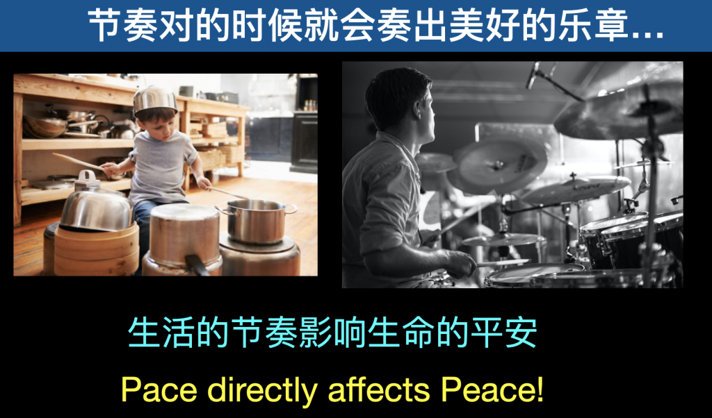 当你经历了一些不平安的时候,你反过来要好好思考自己的节奏了。当你我生命和生活的节奏不协调的时候,就好像一个鼓手不协调的左右手打出来的不是乐章而是混音。我们的人生如何才能奏出美好的乐章? 我们的工作,我们的家庭,我们的信仰,我们的教会生活,所有的都应该有一个协调在一起的乐章的节奏,才能享受平安。