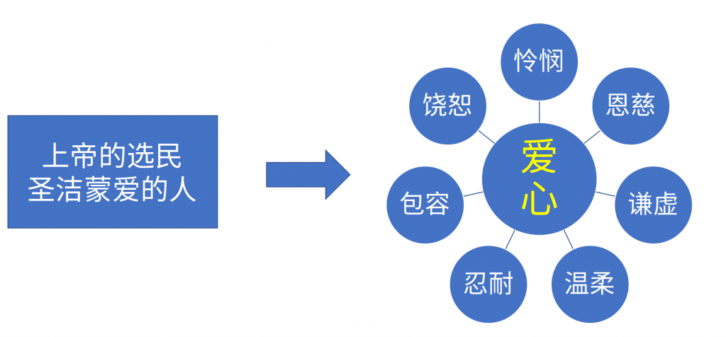 12节到14节里面的“存”在英文里面是“put on(穿上)”的意思。我们基督徒要穿上这些品格。旧人对人的方式导致人和人的冲突,新人对人的方式导致人和人的和平、合一。