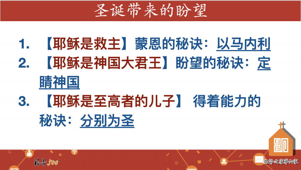 从此不仅以色列人,更是全人类都开启了新约时代的恩典和希望。 我们今天通过天使加百列和玛利亚所说的一些话语来思想:主耶稣是什么样的主耶稣?他的诞生给我们带来什么样的盼望?