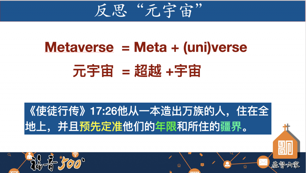 最近开了第13届网络宣教论坛IMF2021,谈论到元宇宙的挑战。元宇宙,简单说就是通过数字技术构建起来的与现实世界平行的虚拟世界。当Facebook一个月前改名Meta的时候,人们开始纷纷思想着如何不直接进入公司开会都可以进入一个虚拟现实工作场所的办公室里面开会的场景。