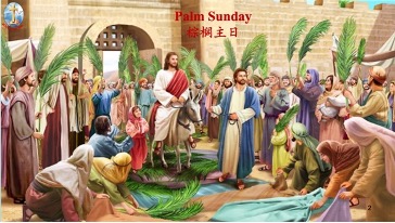 弟兄姊妹們平安!回到實體教會能夠看到弟兄姊妹親切真誠的臉孔真好!我們感謝神!大家知道今天是什麼特別主日嗎?- Palm Sunday 棕櫚主日, 對了!這是主耶穌在世上的最後一週,他騎驢進耶路撒冷城,接受人們的歡呼擁戴!人們把棕櫚枝鋪在耶穌的前頭或揮舞著歡迎主耶穌進入聖城,高聲喊著:“和散那, 和散那,高高在上和散那!”是何等地風光呀!誰知過幾天同樣的一批人卻高喊著,“把他釘在十字架,把他釘在十字架!” 真是情何以堪呀!