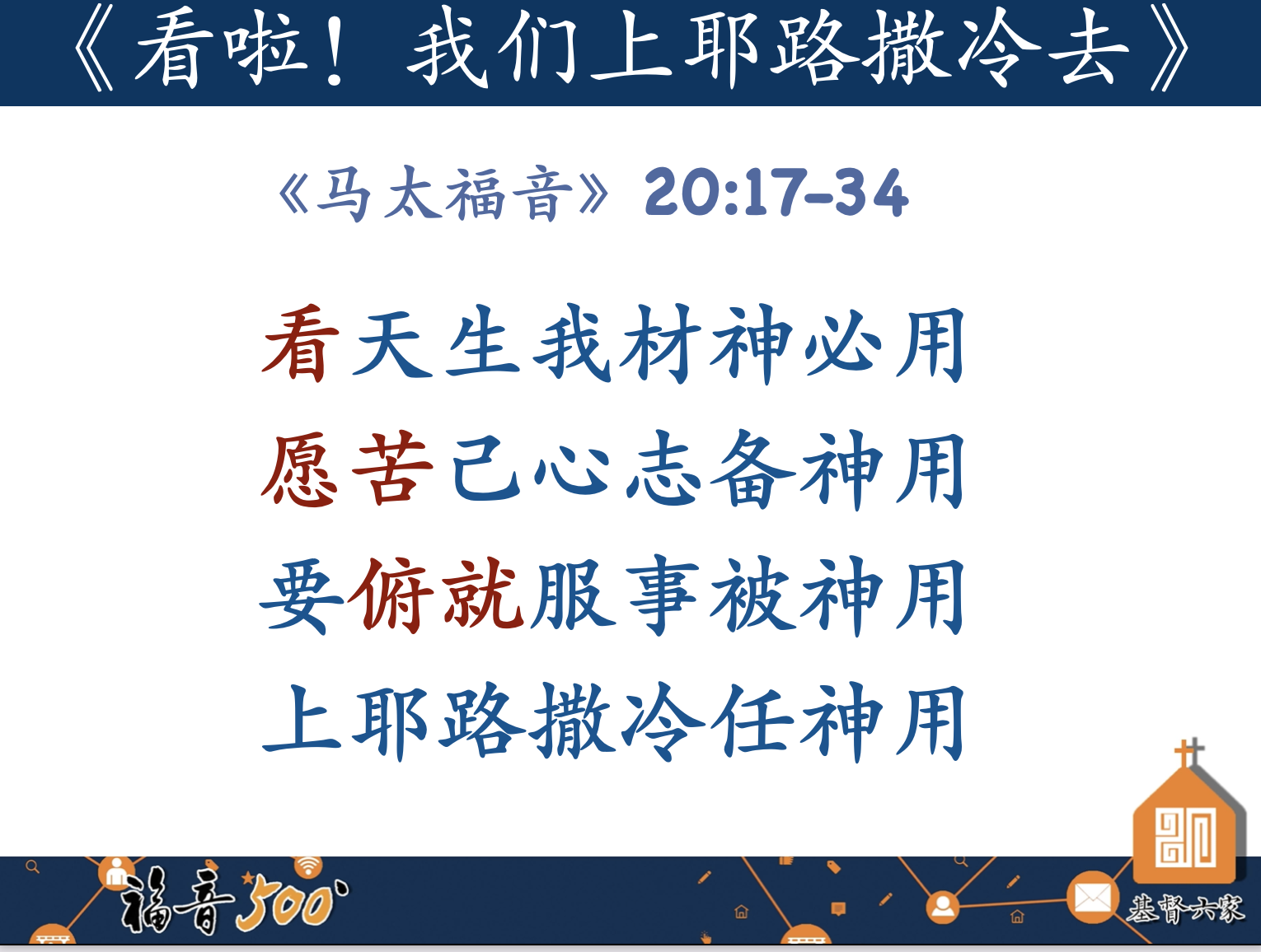 “看啦!我们上耶路撒冷去”,在去耶路撒冷的路上,我们要效法基督耶稣的甘心俯就去服事人。