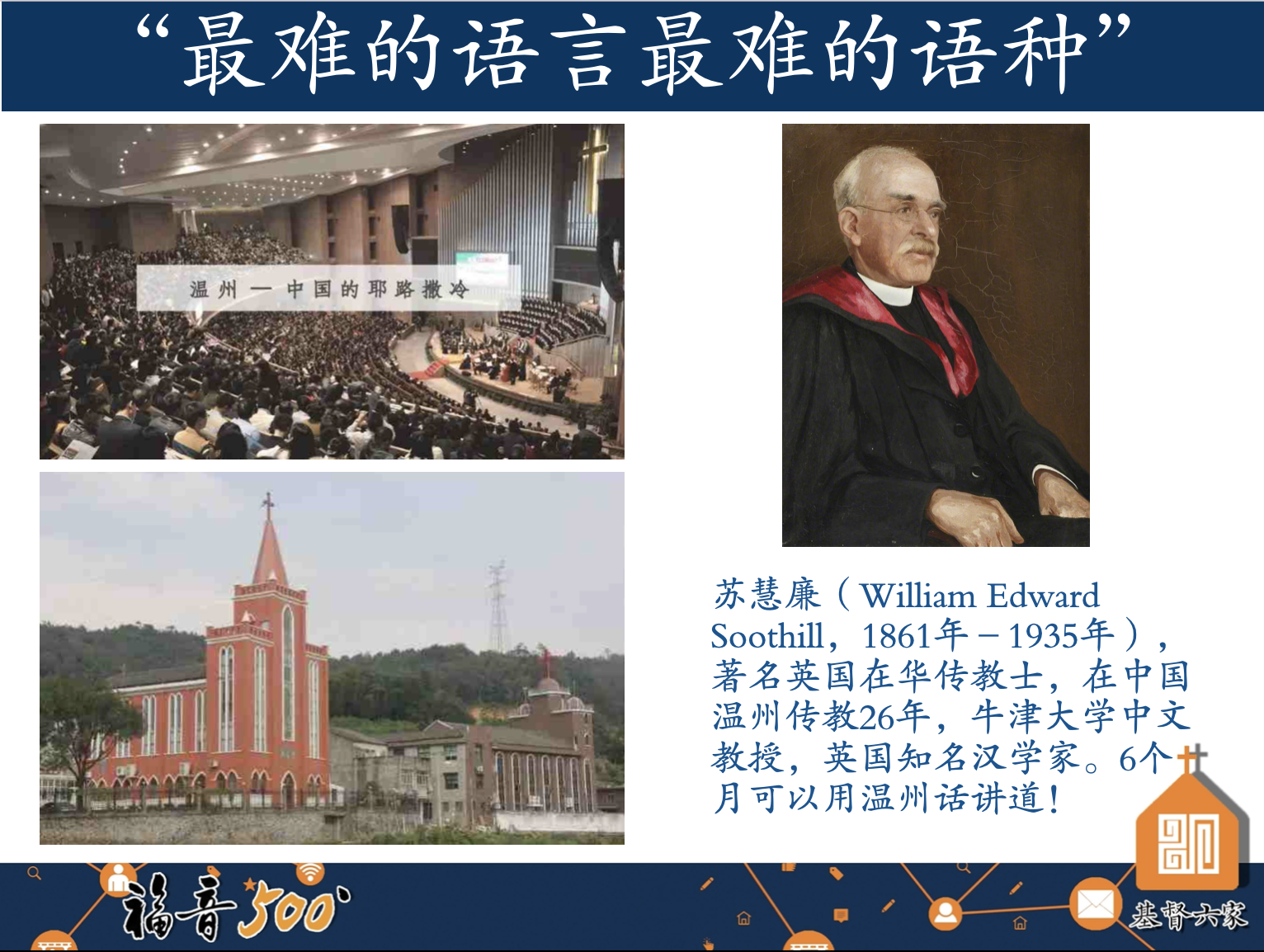【宣教士的见证】联合国发表国最难学的语音的排行榜,最难的是中文。 中文中最难学的方言的排行榜。福建方言仅闽南话入选,与苏州话并列第三,广东话紧随其后,温州话排名第一。 第一個到溫州的宣教士是來自蘇格蘭、內地會的「獨腳番人」曹雅直(George Stott)。從1867到1950年,光是內地會,就差了74位宣教士(包括宣教士死在溫州的兒女),其中因服事而死在溫州的有13位。其中有一位叫苏慧廉初到温州,首先是学习温州话,半年后就能以温州话讲道。
