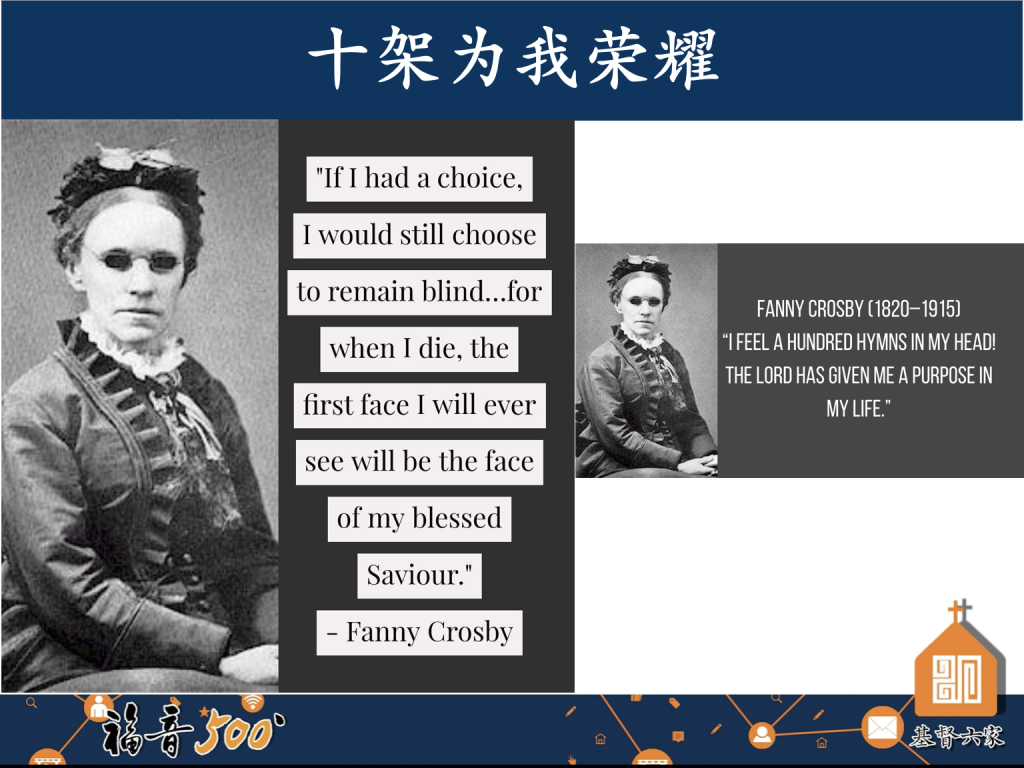 这首诗是美国盲女诗人芬妮、克罗斯比(Fanny Crosby,1820-1915)所写的优美的诗歌之一。它是先由杜恩(William H.Doane 1832-1916)谱好了曲调,再请她作词。词曲配合的很好,所以把调名称为《十字架》。她在生下来6个星期时,眼睛发炎,当地眼科医生不在,临时找了另外一个人来治疗,那人主张以药膏来热敷,没想到就这样把她的双眼都弄瞎了。在她后来的传记里,她提到有一位弟兄可怜她的情况,以为她对自己从6个星期大就失明一定有很多的自卑、自怜、怨恨。但她告诉那位弟兄,“我巴不得我一生下来就是瞎子”。他非常不解地问道:“为什么呢?”她回答:“这样,当我有一天到主那里时,第一位我眼睛能看到的就是我的主耶稣。” 为什么主耶稣在她心中是这么地重要?为什么在她歌词中她说到十字架永是她的荣耀?因为十字架是主的诅咒、刑罚、羞辱、痛苦、弃绝的记号,如今变成她的祝福、赦免、荣耀、喜乐、和好的记号。她每天以主耶稣和他的十字架为荣,就不自夸,不自卑,而在生活中依靠十架大能见证主。这首诗歌的副歌“十字架,十字架,永是我的荣耀。”是发自内心深处的呼声,唱者、听者都会受感动。