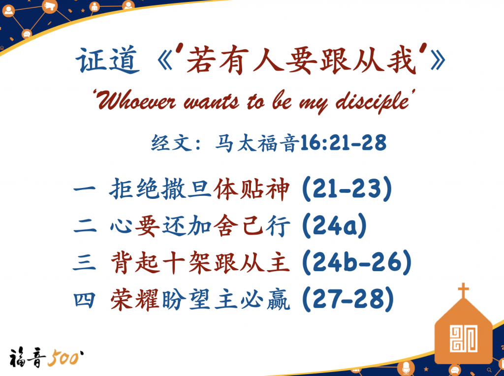 其实对我们而言,我们背十字架不一定意味着死亡,但必须有赴死的决心。对我们而言,可能需要放弃自己的雄心壮志, 可能是放弃居住的地方,可能是一个不错的位置和薪水,甚至一个职业。