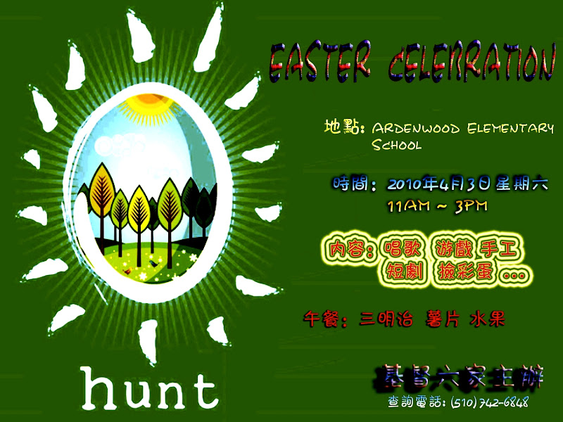 本家於4月3日星期六11am-2pm在Ardenwood小學的草地举办了Easter活動,包括午餐,撿蛋,唱歌,表演,遊戲等;有一百多位小朋友和近百位成人参加。孩子们都玩得很开心,感谢神赐给我们这么多可爱的小孩,神也在连续数天的春雨中,特别给了我们一个晴朗的星期六,让我们有个好天气来举办这个活动,相信主会为我们开路,为将来的Awana预备更多的孩子。感谢神!