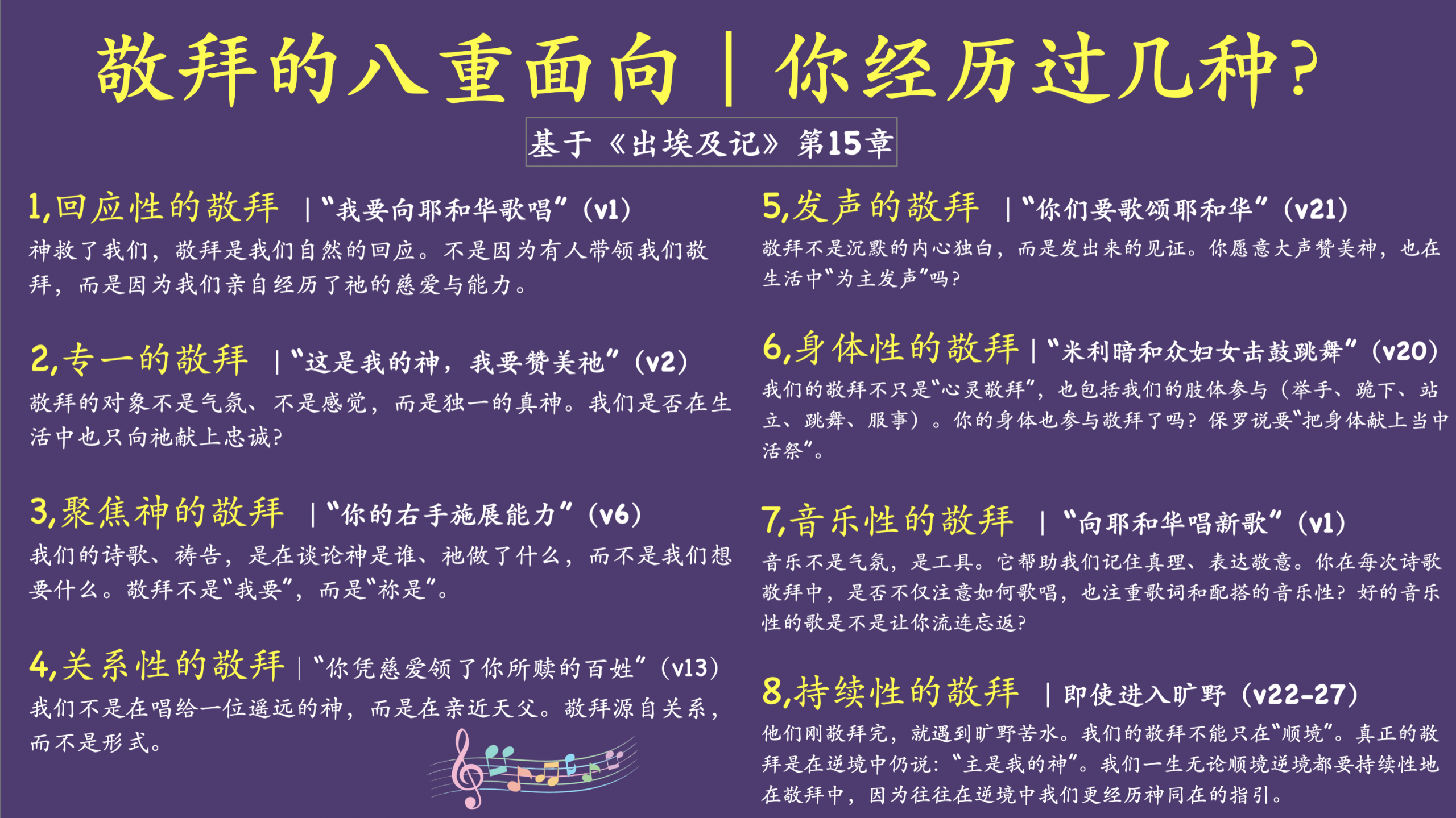 我们的敬拜不只是“心灵敬拜”,也包括我们的肢体参与(举手、跪下、站立、跳舞、服事)。你的身体也参与敬拜了吗?保罗说要“把身体献上当中活祭”。 - 音乐性的敬拜|“向耶和华唱新歌”(15:1)