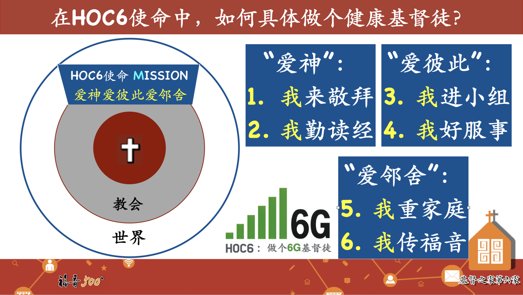 不是手机的“5G”,而是基督六家(HOC6)教会为我们全体信徒量身打造的六个生命行动,具体回应主耶稣给我们的最大诫命:“你要尽心、尽性、尽意爱主你的神;其次也相仿,就是要爱人如己。”