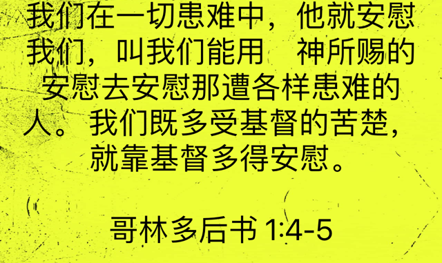 經文: 林後1:4-5我們在一切患難中, 他就安慰我們, 叫我們能用神所賜的安慰去安慰遭各樣患難的人. 我們既多受基督的苦楚, 就靠基督多得安慰.