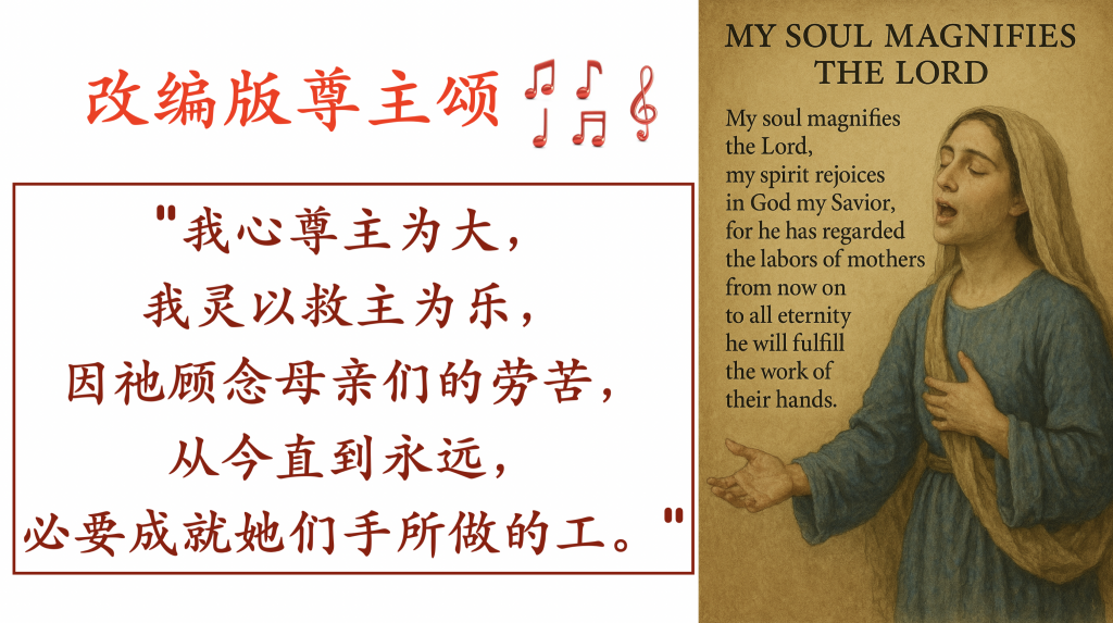 今天让我们推出定制版的尊主颂:”我心尊主为大, 我灵以救主为乐, 因祂顾念母亲们的劳苦, 从今直到永远, 必要成就她们手所做的工。”