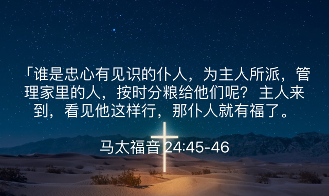 45「谁是忠心有见识的仆人,为主人所派,管理家里的人,按时分粮给他们呢? 46主人来到,看见他这样行,那仆人就有福了。