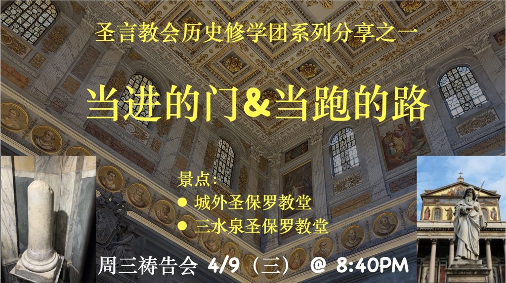 特别预告:从今天开始,教会的周三祷告会会连续分享圣言教会历史修学团的学习所得,今晚的分享也会特别展示罗马城外圣保罗大教堂圣门入口处的配搭2把钥匙的三重冕的图片。
