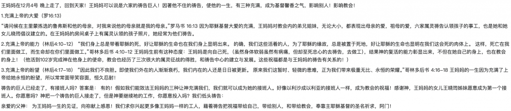 🎶灵晨灵粮🍇12月31日 黎广传牧师:〈怀念王妈妈〉 2024年12月31日 Huo, Michael 靈修, 靈晨靈糧 0 王妈妈在12月4号 晚上走了,回到天家!王妈妈可以说是六家的祷告巨人!因著他不住的祷告,使他的一生,有三种充满,成为基督馨香之气,影响别人!影响教会! Post Views: 231