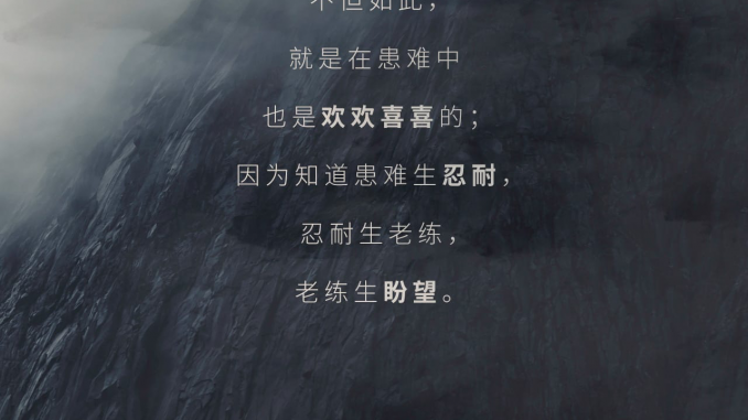 每一次「忍耐」的经历,都会使我们对神的旨意有多一点的体会。长期的「忍耐」,能使人对属灵的事情越来越「老练」。因为患难、忍耐能炼净神儿女里面的杂质,使我们向着神的心更加单纯,生命更加成熟,更加盼望「神的荣耀」。当我们走过从「患难」、「忍耐」、「老练」到「盼望」的恩典历程时,就会明白神的眼目一直在「患难」的环境中看顾我们,一直藉着圣灵将神的爱浇灌在我们心里。所以,可以确信我们所盼望的「神的荣耀」不会落空,「不至于羞耻」。