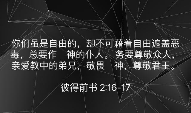 你們雖是自由的,卻不可藉著自由遮蓋惡毒(或作:陰毒),總要作神的僕人。務要尊敬眾人,親愛教中的弟兄,敬畏神,尊敬君王。