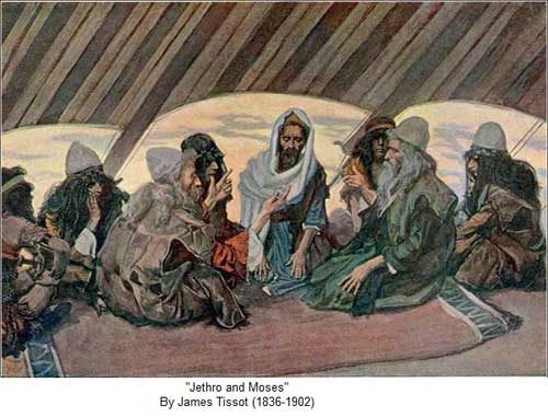 后来,叶忒罗听说耶和华战胜了埃及人,就立即带着西坡拉和摩西的两个儿子到何烈山去见摩西,受到后者热烈欢迎。摩西向叶忒罗细说耶和华怎样施展大能拯救以色列人,叶忒罗就称颂耶和华,并且认同:“我现在确实知道,耶和华比万神都大。”然后,他向真神献祭。(出18:1-12)第二天,叶忒罗看见摩西“从早到晚”听以色列人申述他们的难题,深知这样做会使摩西和民众精疲力竭,于是提议摩西把权力下放,训练一些精明能干、信实可靠的男子,立他们做十夫长、五十夫长、百夫长和千夫长,让他们也断案,惟独他们无法处理的案件,才呈给摩西审讯。摩西同意这个建议。最后叶忒罗就回到自己的地方去了。(出18:13-27)