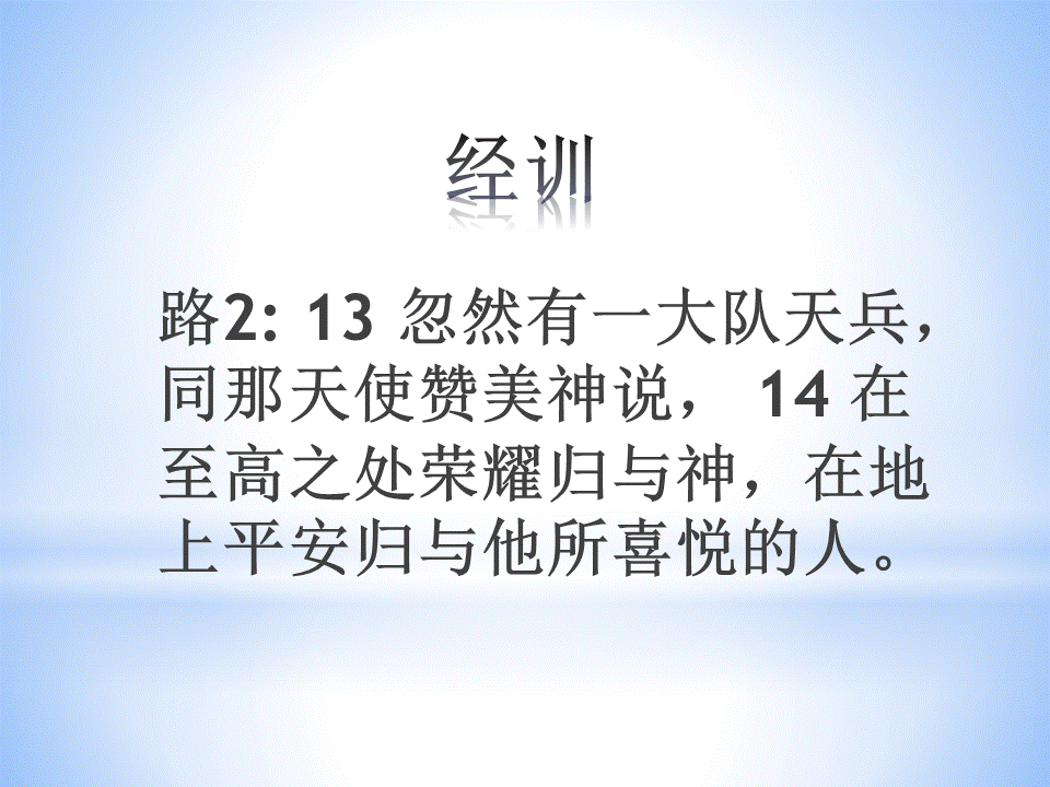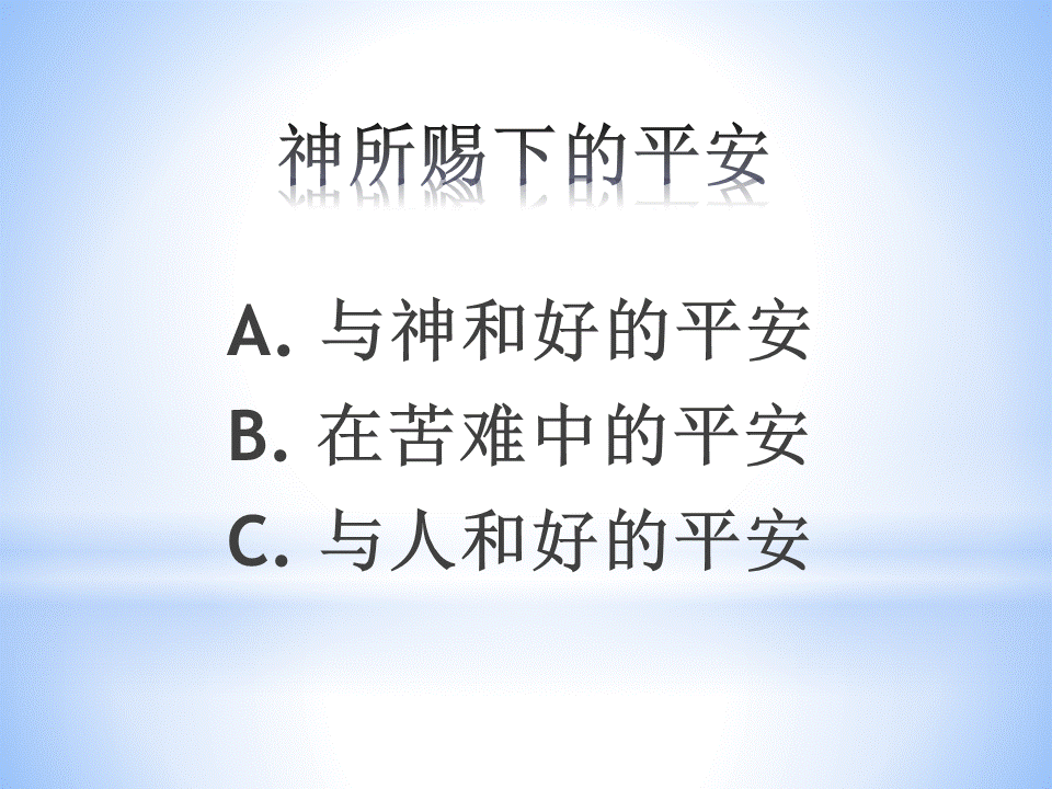 救主降生,天使發出讚美之聲說:在至高之處榮耀歸於神,在地上平安歸於祂所喜悅的人。天使的讚美有兩個重點:1 是神的榮耀,2 是神的平安。神的榮耀就是指神特別的作為:這個作為就是讓祂的獨生子降世,賜給我們!這個讚美,我個人認為保羅在提前3:16表達的最透徹,那裡說:大哉!敬虔的奧秘,無人不以為然,就是:神在肉身顯現,被聖靈稱義,被天使看見,被傳於外邦,被世人信服,被接在榮耀裡!神所賜下的平安有三方面,是我今天所要講的內容。神所賜的平安,喜悅的人就得着了。什麼是神所喜悅的人呢?不是靠自己的努力討神喜悅的人,乃是真正信靠祂獨生的兒子(耶穌基督)的人(來11:6;約6:29),才能得主的喜悅。我們生活在這個世界裡,很需要平安,祂就賜給我們: