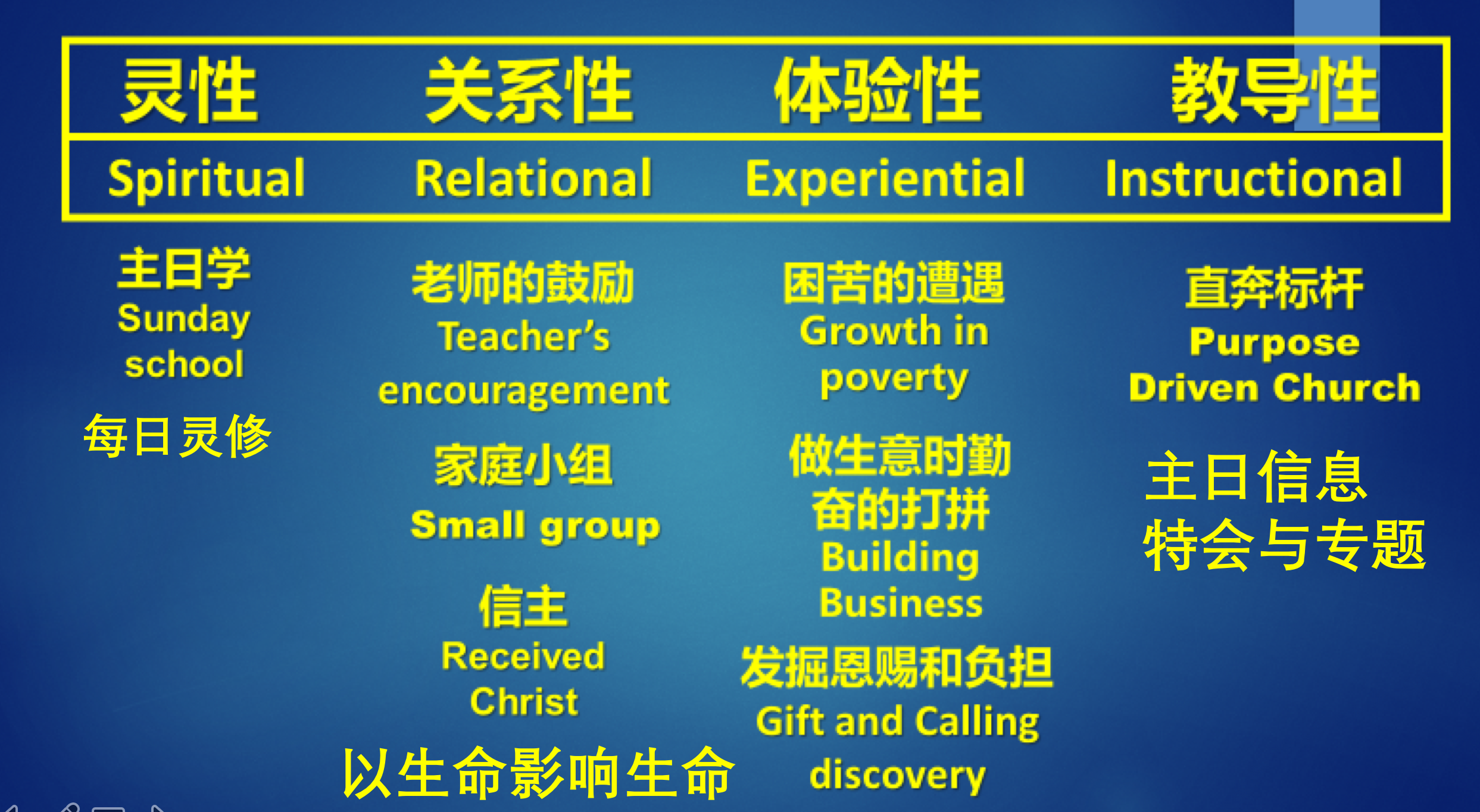 主耶穌的大使命是使萬民做主的門徒。做主的門徒,不是就是信主而已,不是仅仅提供各種課程訓練讓他們知識的增長而已,是陪伴,是一起成长的全人塑造,在这四个方面要一起重视,缺一不可。