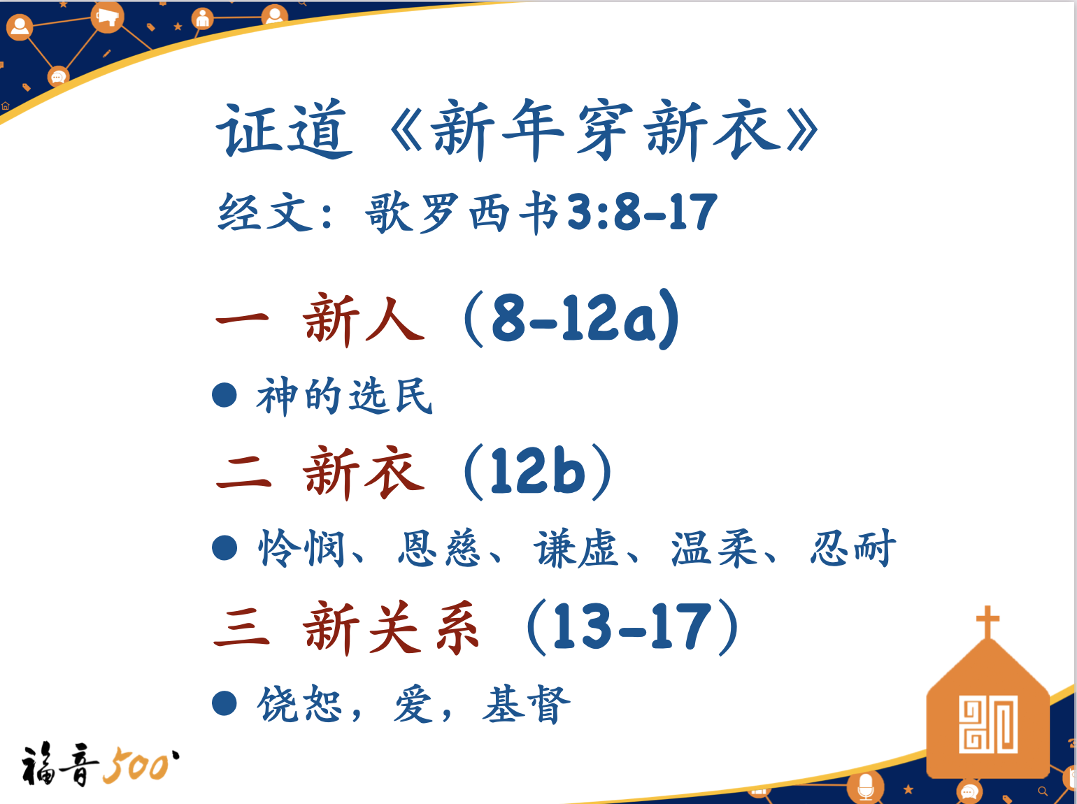 在新的一年里,让我们经常提醒自己,我们要时刻来到荣耀的救主耶稣面前,我们要在拯救衣的外面,不应该有“淫乱、污秽、邪情、恶欲,和贪婪”等旧衣,我们需要穿上新人的衣服。和我们被拣选的身份相符。