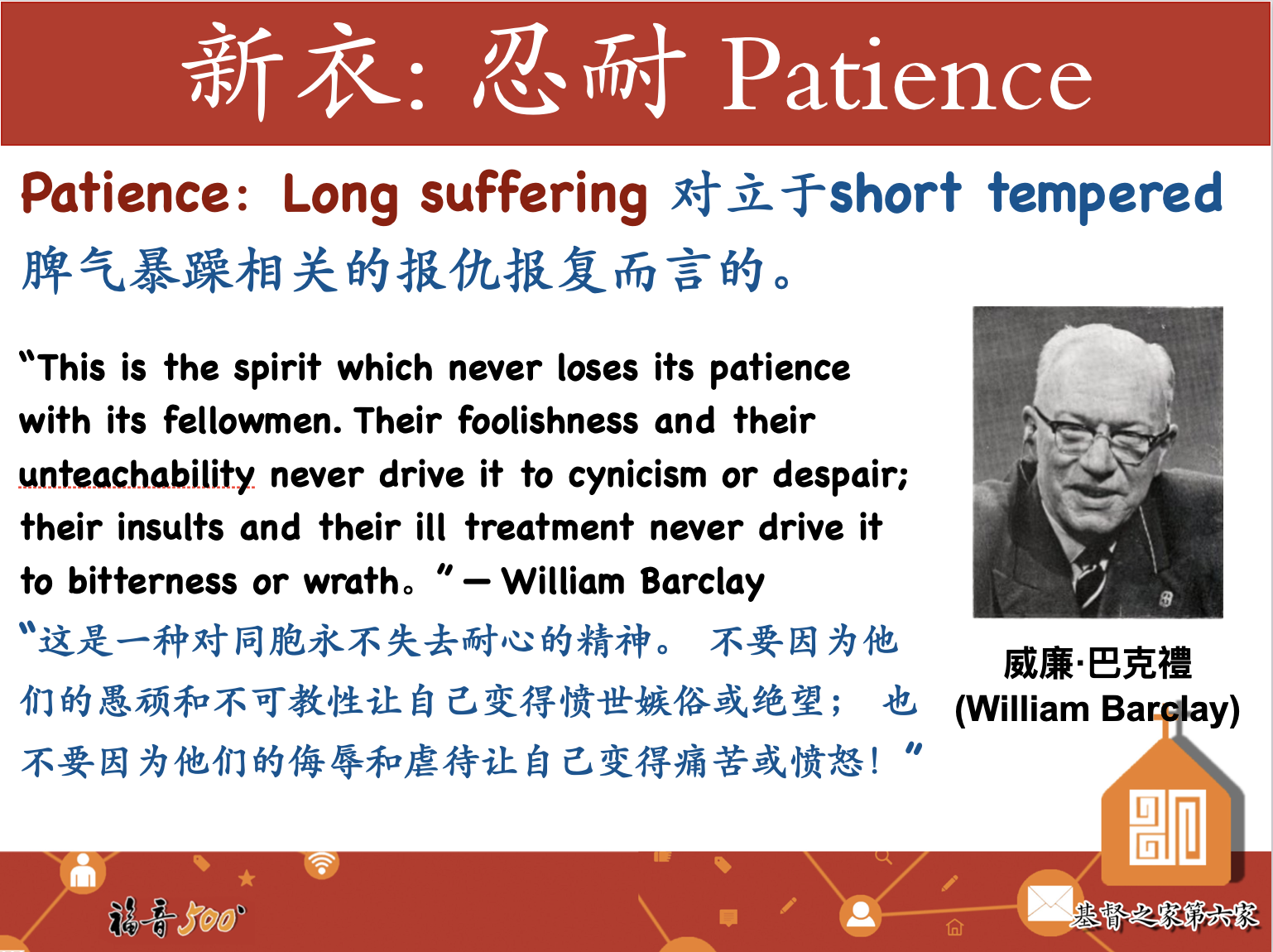 恩慈需要我们 No Harshness 不再苛刻地要求别人。 主耶稣说“我的轭是容易的 我的担子是轻省的”。 主耶稣用的是恩慈的方式带领并鼓励他的门徒,并非苛刻!主耶稣从来不会像法老或世上的老板君王那样敲我们的头让我们不得不做工前行。